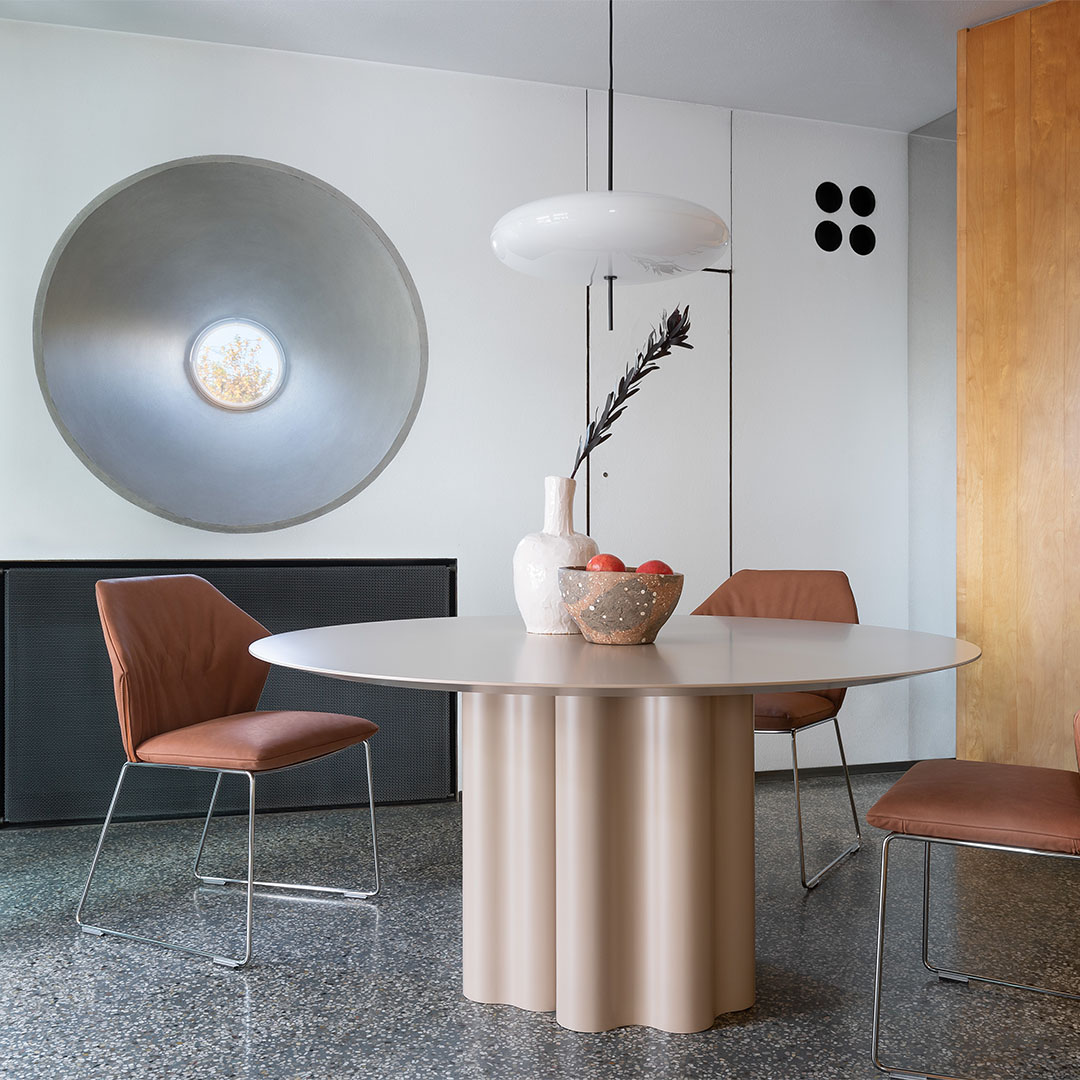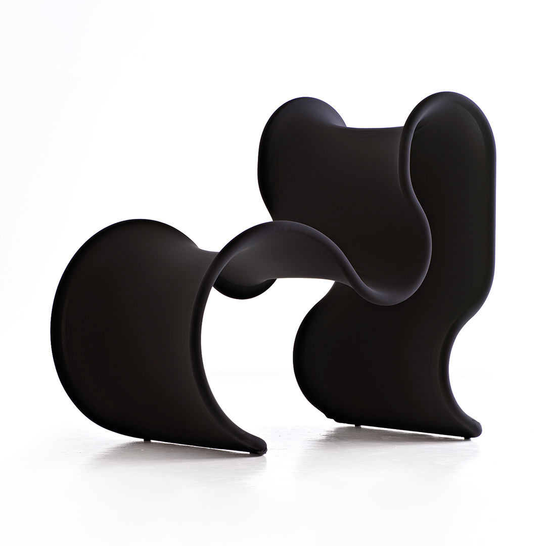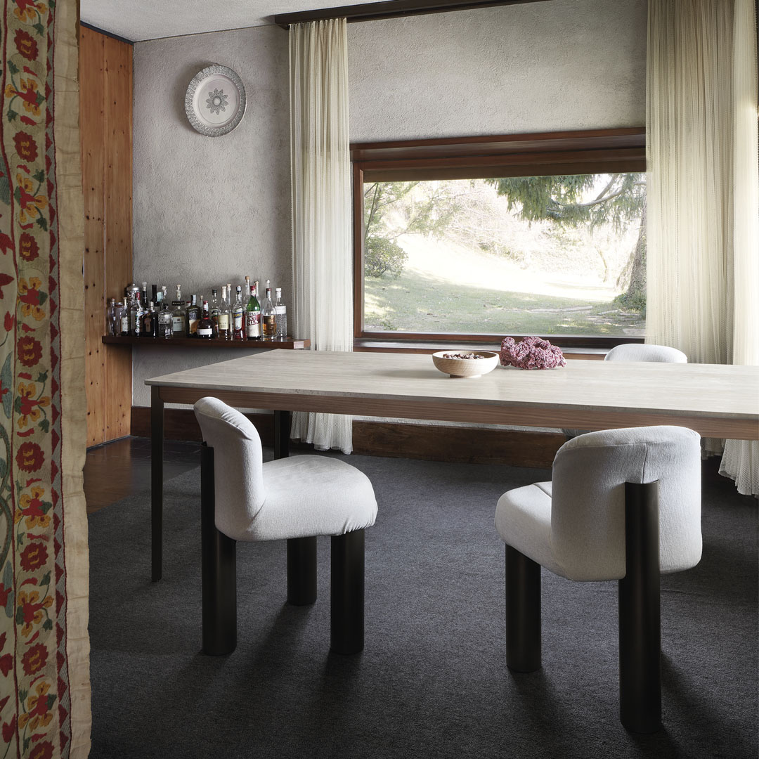 Does form follow matter or does matter follow form? Each furniture, characterised by large, enveloping volumes, responds in its own way. Seductive, these furnishings clearly define their design and occupy the space boldly with curves and solids. Their cartoon DNA dictates their shapes and technology helps launch the challenge of typological change, to subvert the rules. Just as an entire sofa can develop from a single cushion, so an upholstered armchair softens the Brutalist-inspired lines. Also, an enormous horseshoe-shaped, sausage-like cushion defines the back and armrest of a wide low chair, obtained by two different rotational mouldings and combining a rigid plastic and a more elastic polymer. A rigid polyurethane curtain gives sculptural features to a table base. A wide Latex strip characterises a cosy chaise longue mounted on a tubular metal frame covered with a polyurethane foam coating. The sensation of looking at something modelled on a freehand sketched idea does not change if the material is fragile, transparent and diffuses light. Nor if one strengthens the wooden legs of chairs and consoles while maintaining grace. The elegant softness and visual comfort of the furniture is reflected in an environment with the opposite atmosphere: hard, made of metal and ceramic, punctuated by textile backdrops, it exudes a refined and suggestive feeling of rigour and light. Following a trend that is once again current, it accentuates the need for a material presence in interiors. The shades of grey make these items neutral yet lively, capturing and reflecting the flashes of light of the surrounding environment and what it contains, also prompting bold combinations. The wide proportions of the furnishings fade in the reflections of the walls and show their plastic, natural and organic lines to the point of turning the real world into an imaginary realm. A metaphor for a place that becomes welcoming again.